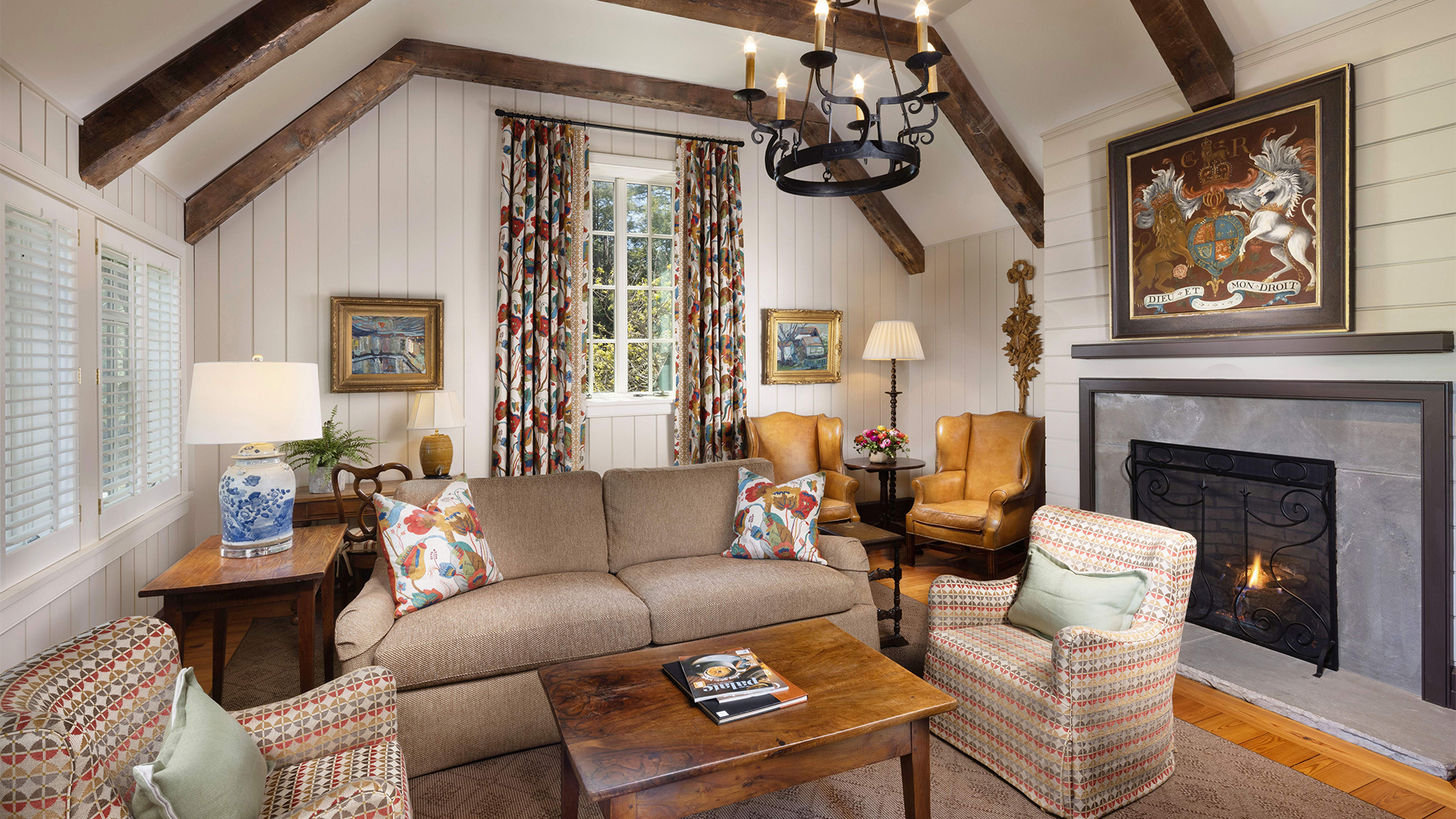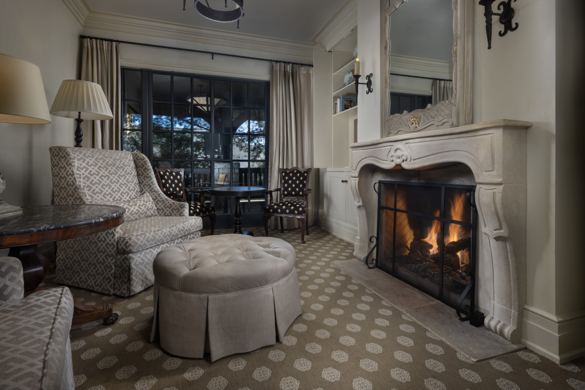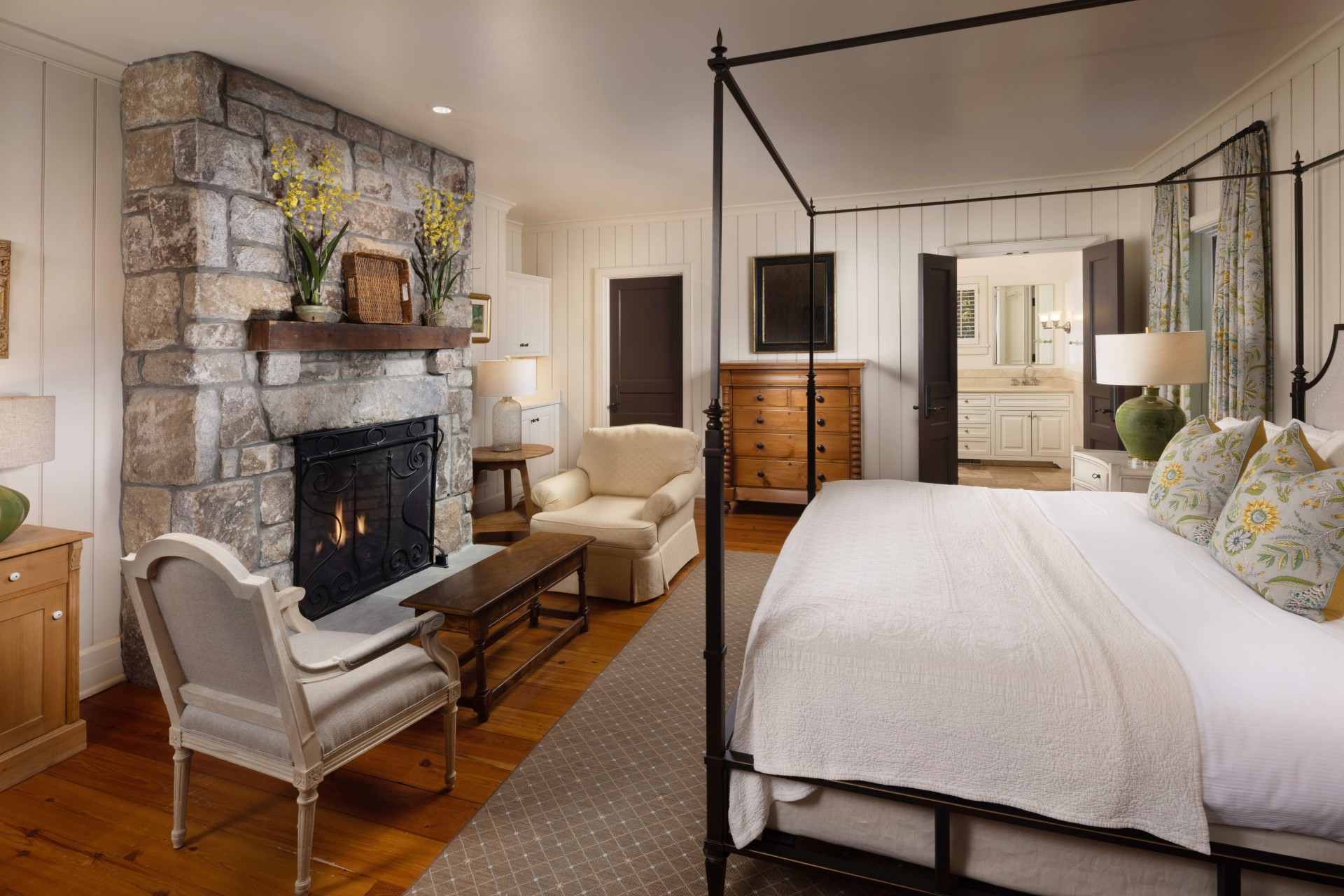 This stand-alone suite in the Spa courtyard has a separate bedroom and living area—both with a fireplace in a unique layout. The suite has distinct décor, a king-size iron 4-poster bed, a bathroom with heated marble floors, a walk-in shower and tub, and a deck.