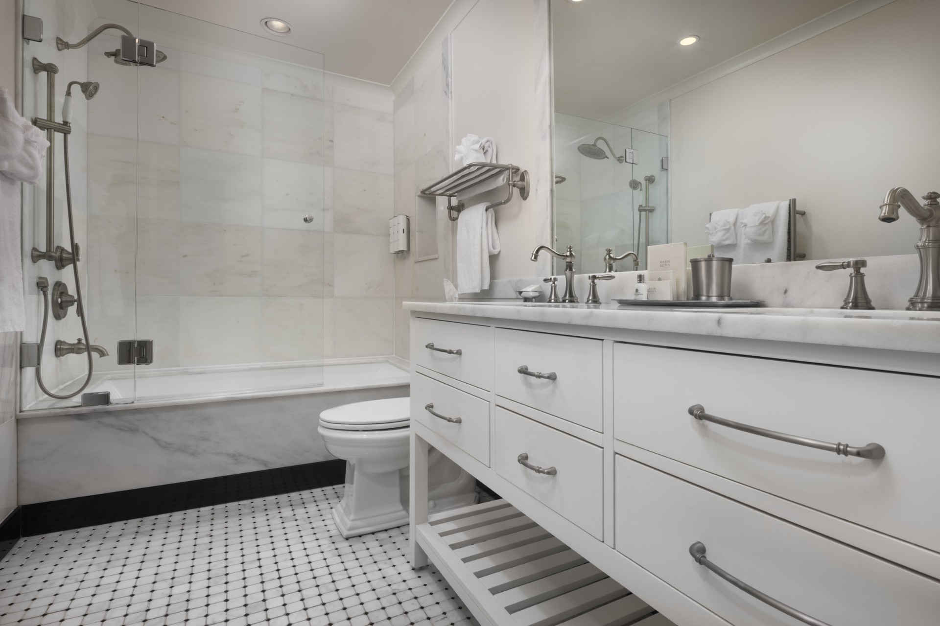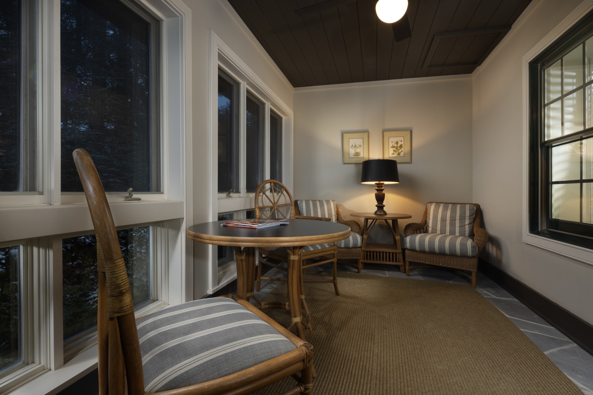 Located above The Lodge lobby, each uniquely designed Lee King Suite features a king-size bed, a fireplace, a cozy sitting area with a sofa, and a small bistro table. Bathrooms feature walk-in showers, bathtubs, and heated marble floors. A wide wrap-around porch offers views of the Lodge Lawn.